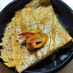 Crepe francés relleno de flan pastelero y frutas marinadas (dos frutas de elección según disponibilidad)